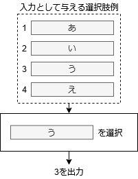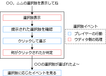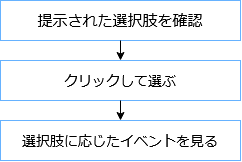 まず,提示された選択肢を確認するためにはそもそも表示させる選択肢を設定し,それを表示する処理が必要となるはずです.クリックして選択する際にも,クリックされた選択肢はどれなのかを判定する必要がありますし,「判定された選択肢が何か」という情報も受け渡さなければ選択肢に応じたイベントを見ることもかないません.すなわち,上記の図はこんな感じに書き換えることができるのではないでしょうか.