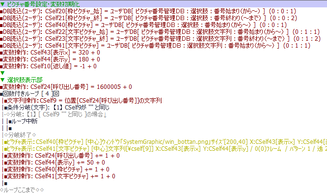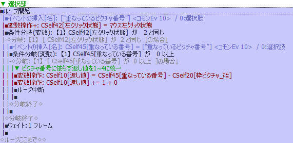 各選択肢がクリックで選ばれたか否かを判定するだけならクリック後にこのコモンを呼び出すだけでいいのですが,横着してボタンのフラッシュ動作も中に組み込んでしまったので,選択部のループ毎に呼び出しています.また今回は枠のピクチャ番号を0~99の範囲に設定したため,「重なっているピクチャ番号」を呼び出すと0~99までで重なっているピクチャ番号があるか否かを判定することになります.また枠のピクチャ番号はDBに登録した番号の先頭から順に使われていくはずなので,マウスと重なっていたピクチャ番号とDBの数字から何番目に表示した選択肢なのかは容易に特定することができます.