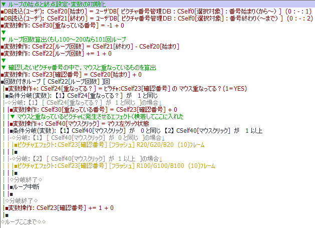 このイベント中で呼び出されている,「重なっているピクチャ番号」というコモンイベントは以下の通りです.