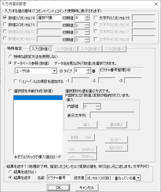 少なくともここで設定しなければならないのは,選択肢の枠のピクチャ番号と選択肢の文字列のピクチャ番号です.枠と文字列のピクチャ番号群を分けている理由は後程しますが,枠の番号<文字列の番号になるようにしてください(枠の下に文字を置きたい場合は別ですが)