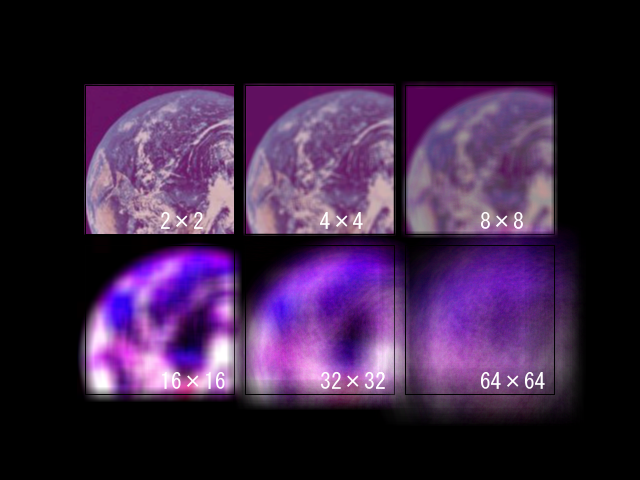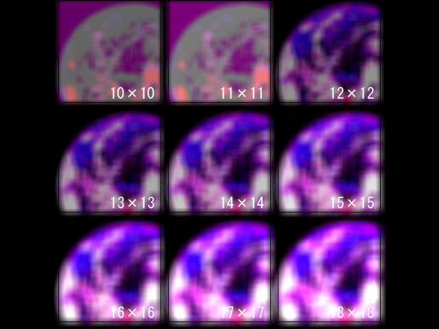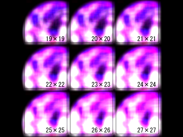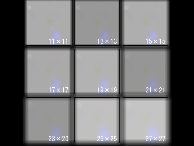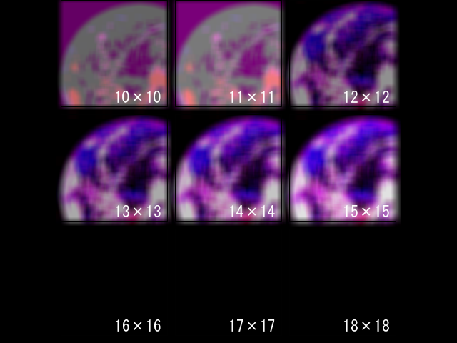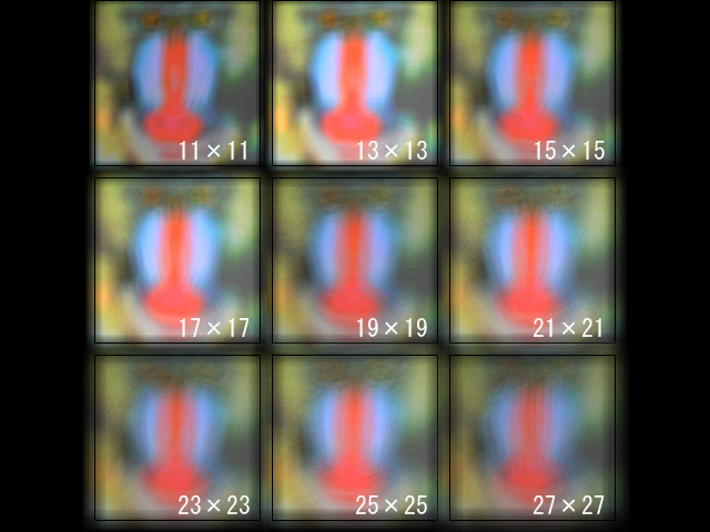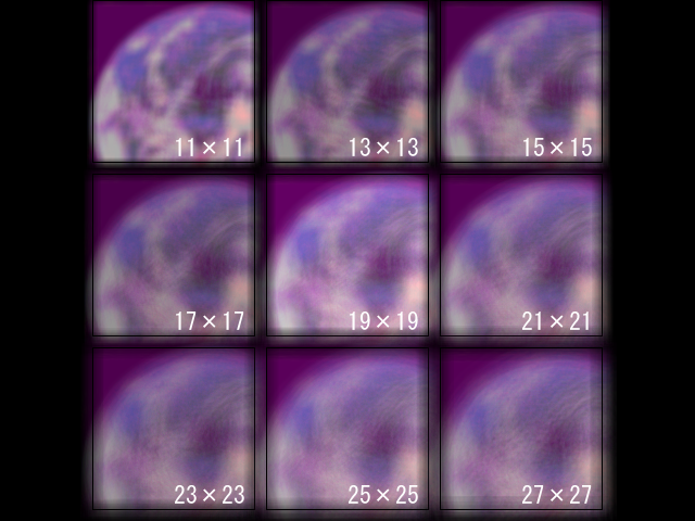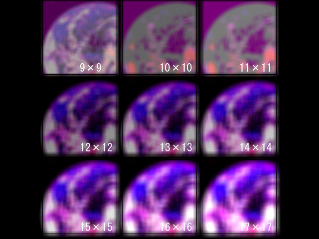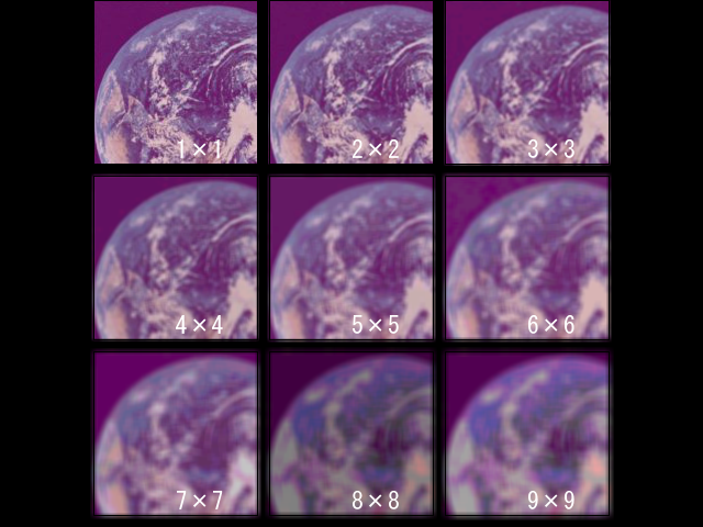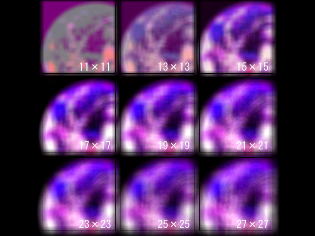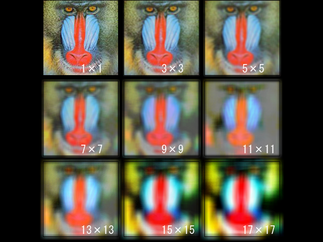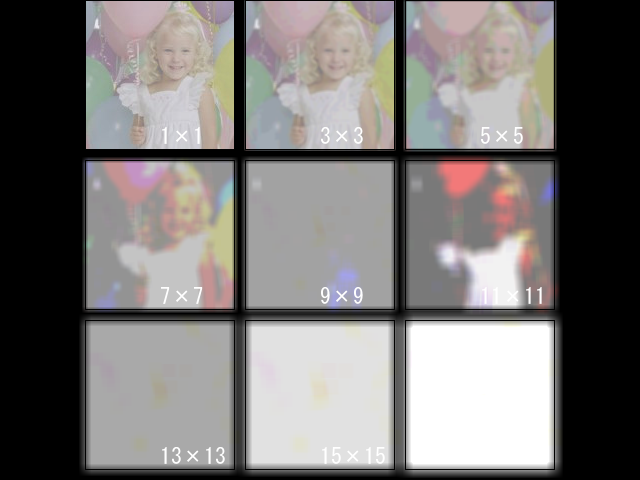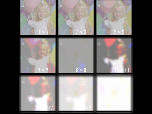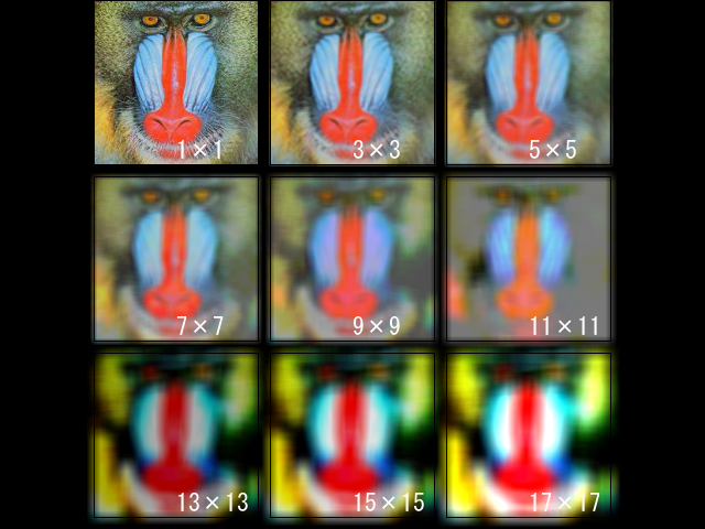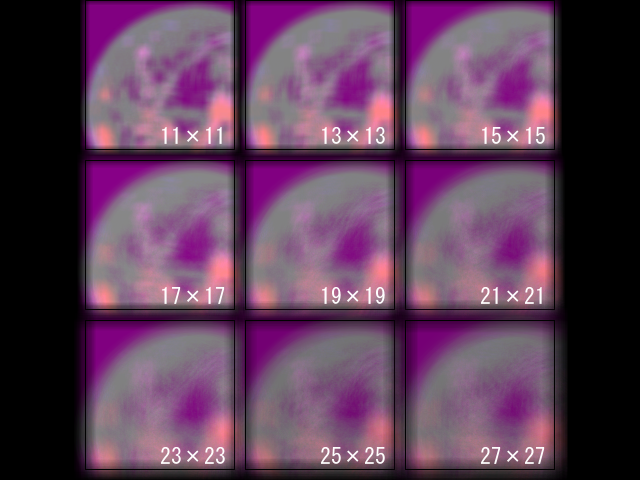 二枚目の最下段は 16x16 ~ 18~18 領域の平均化の結果ですが,さっきぎりぎり大丈夫と書いたはずの 16 x 16も,どうやらダメっぽいですね(255/256の小数点以下切り捨ては0).ということは 15x15 領域の平均化が限界ということなんでしょうか...?