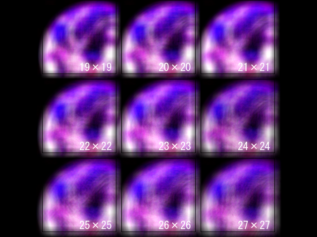 特に13x13の場合は全画像数が169枚なのに対し,計算上各画像の不透明度は1となってしまうため,画像のうちのおよそ半数に対し不透明度を+1しています.そのため改良後の処理では改良前には描画できなかった画素まで表示できている場合があるというわけです.